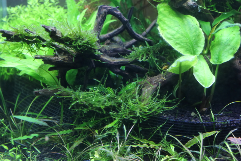 生体を入れる前にも流木や葉に白い短い糸状のコケ(黒髭ゴケ)が付着